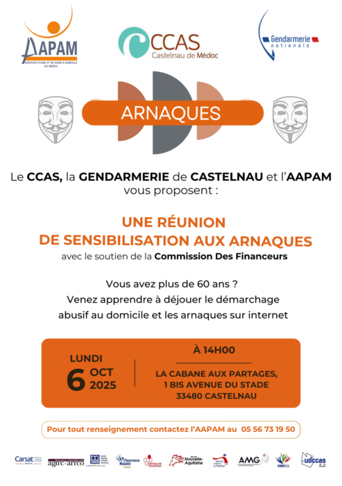 Le CCAS de Castelnau, en partenariat avec la Gendarmerie de Castelnau et l’AAPAM du Médoc, organise une réunion de sensibilisation aux arnaques avec le soutien de la Commission des Financeurs.