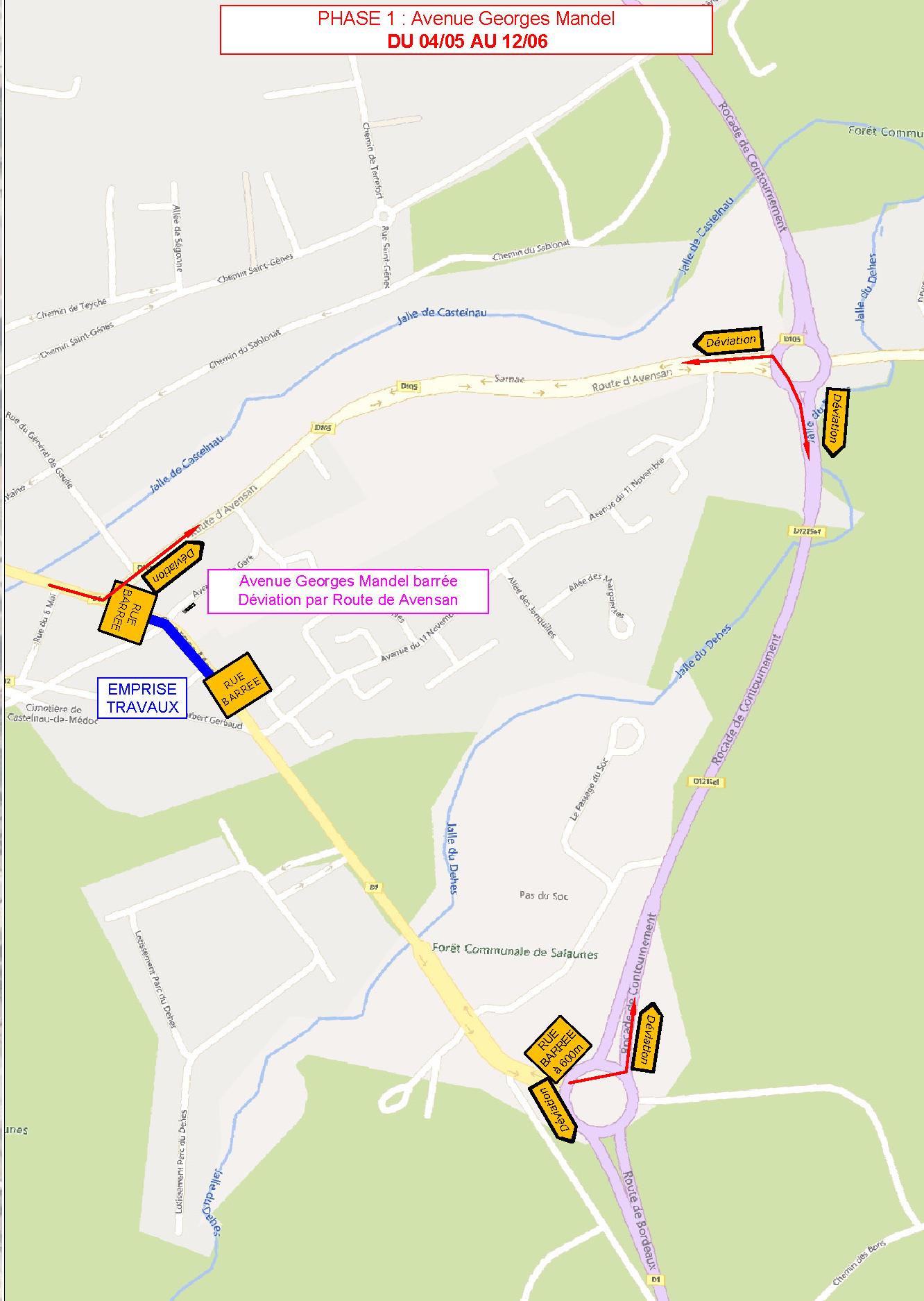 • Une déviation sera mise en place par la route d’Avensan la voie de contournement (au rond-point d’Avensan)