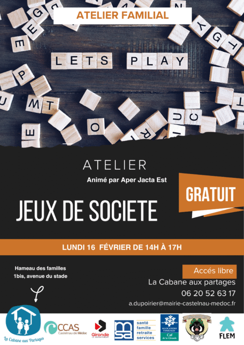 L’association Aper Jacta Est prendra place dans les locaux de la Cabane aux Partages pour vous proposer un après-midi jeux de société. Vous découvrirez une large gamme de jeux, à jouer en famille ou entre amis.