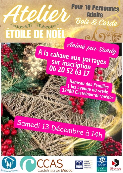La Cabane aux Partages vous propose un atelier proposé par une bénévole de l’Espace de Vie Sociale : Sandy. Au programme, création d’une étoile de Noël en bois et en corde.Cet atelier est destiné aux adultes. Sur inscription à La Cabane aux Partages !