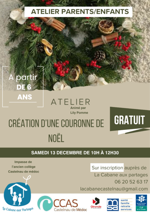 La Cabane aux Partages vous propose un atelier création d’une couronne de Noël. Du sapin frais français, de l’eucalyptus, du houx, des oranges séchées et de la cannelle. Quel beau mélange pour une couronne réussie, à accrocher à sa porte d’entrée.