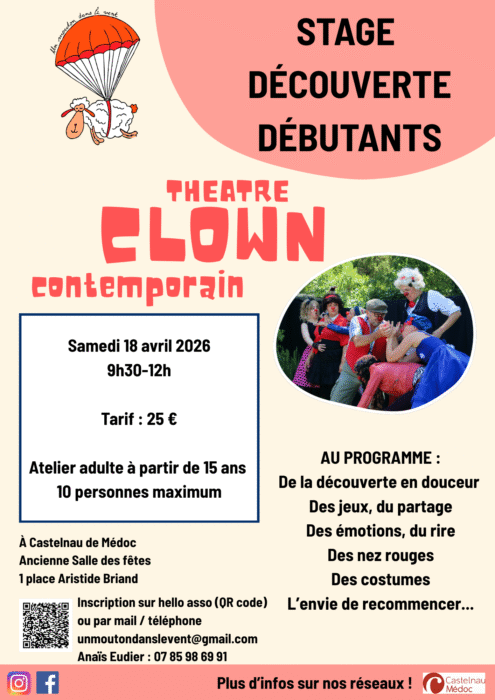 Une matinée toute en douceur pour les débutants, curieux, attirés, craintifs ou confiants … pour tous ceux qui veulent partager un moment convivial d’expérience, de jeu, de rire, de mise en mouvement, de lâcher prise … autour du théâtre clown contemporain !