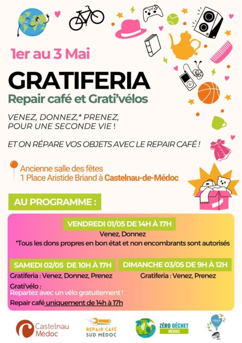 - Samedi 2 mai (10h–17h) : Gratiferia et vélos gratuits. Venez donner et/ou prendre des objets, vêtements, vélos gratuitement. Repair Café présent uniquement de 14h à 17h