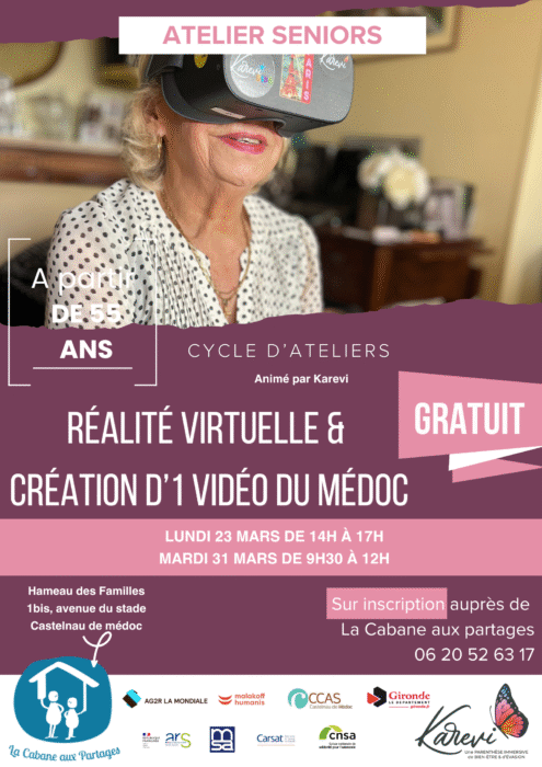 Le Médoc, oui, mais lequel ? Celui de vos souvenirs ? Celui d’hier et d’aujourd’hui ? De Mars à Juin, Vanessa de Karevi vous propose de créer une vidéo immersive. Cette vidéo servira aux personnels soignants pour rendre les soins plus doux. Tout ça, grâce à la réalité virtuelle.