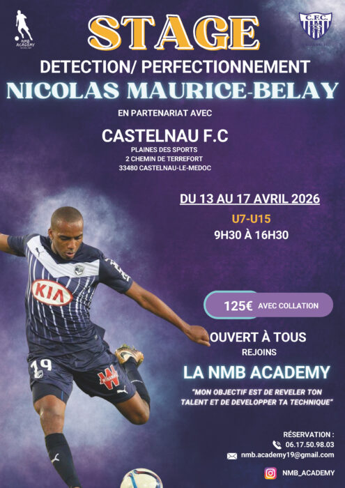 La commune de Castelnau de Médoc accueillera du 13 au 17 avril 2026 un stage de football dédié à la détection et au perfectionnement des jeunes joueurs, organisé par le Castelnau Football Club et la NMB Academy.
